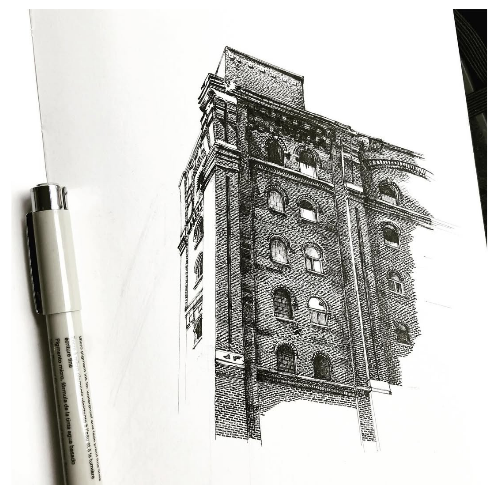 Through detailed line drawing, from facades and windows to urban corners and street details.