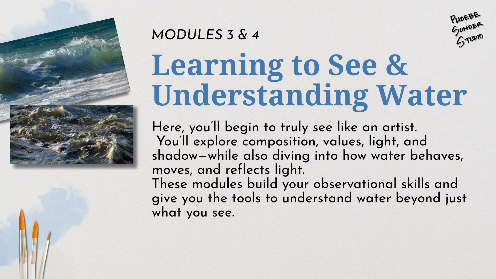 You’ll learn the essentials of observing and painting water: how to capture light, movement, depth, and color in a simple, approachable way.